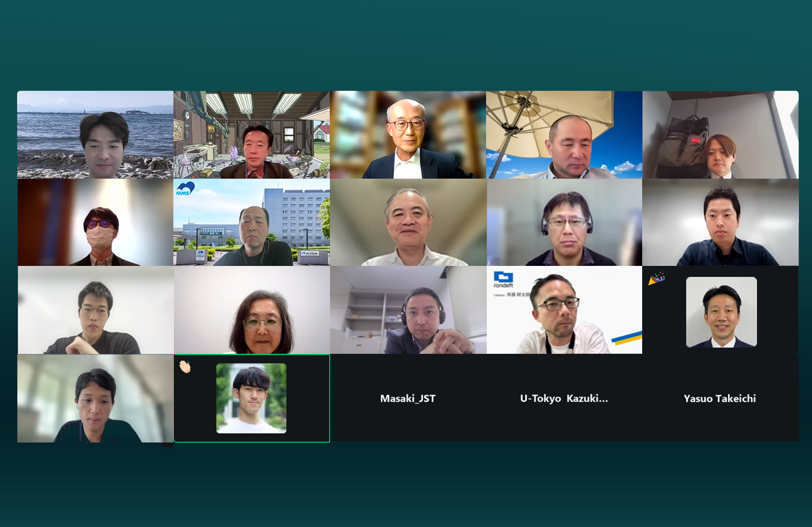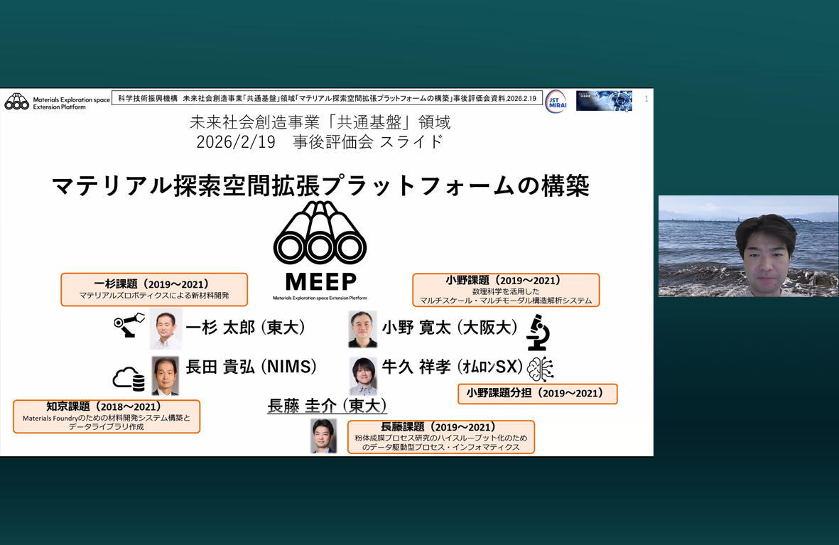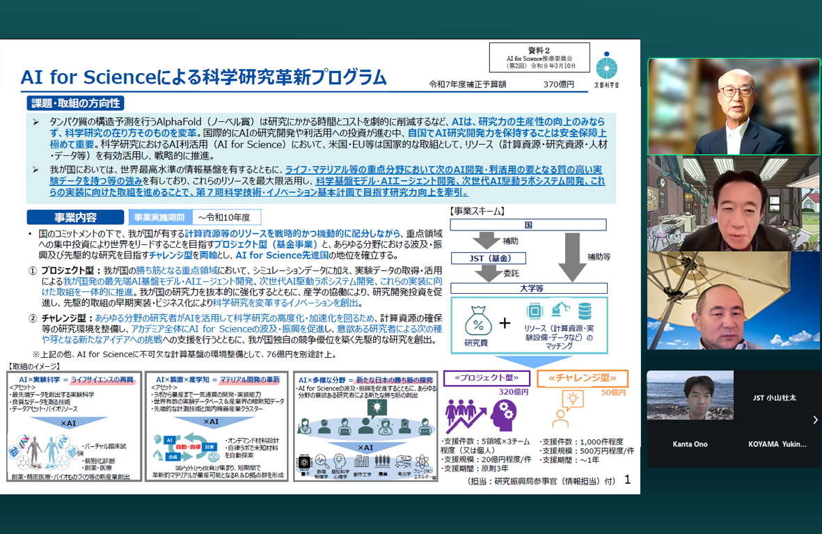 最初に長藤PLよりスライドを共有しながら、MEEPの活動の振り返りおよび事後評価に関する報告が行われました。その後、長我部統括および岡島TMにもご参加いただき、MEEPの評価理由や今後への期待についてメッセージをいただきました。さらにはメンバーでAI for Scienceに向けて、今後の目指すべき方向性や目標、海外の動向も踏まえた深いディスカッションが行われました。